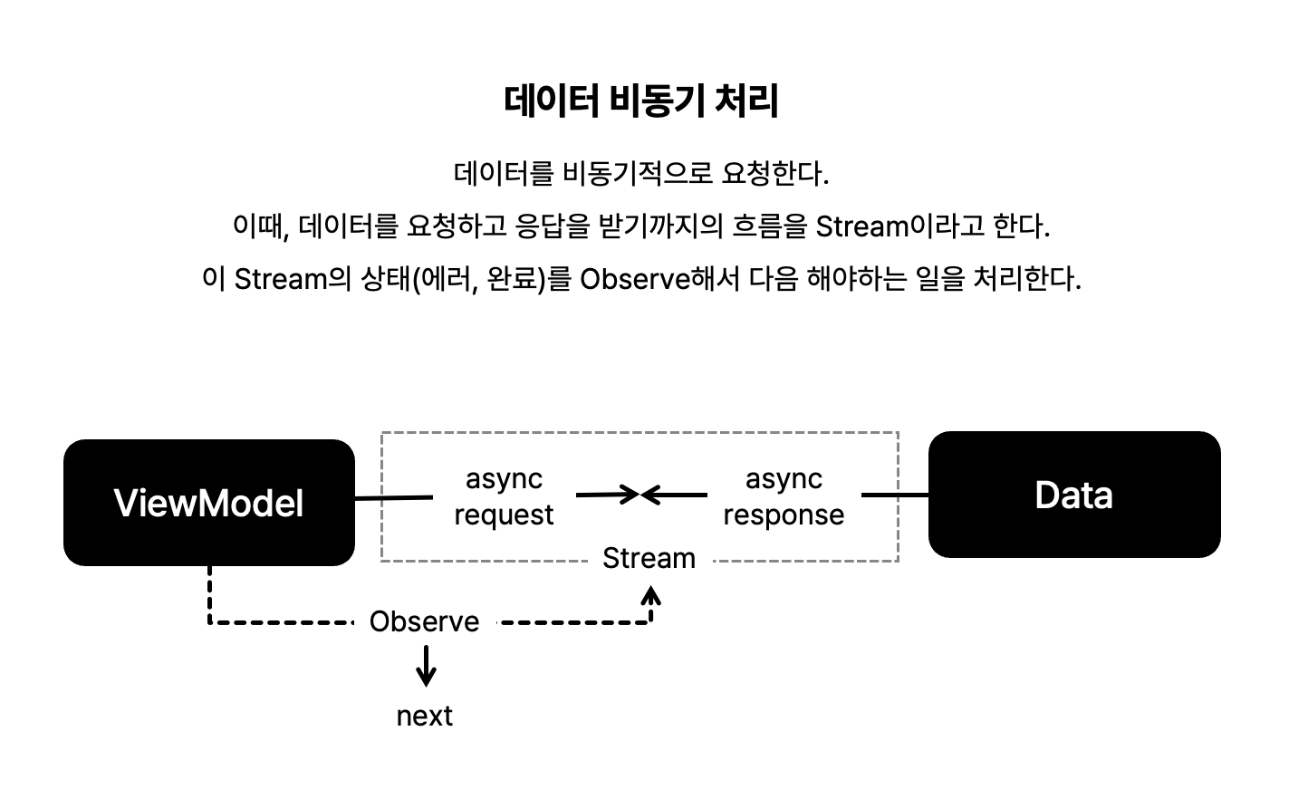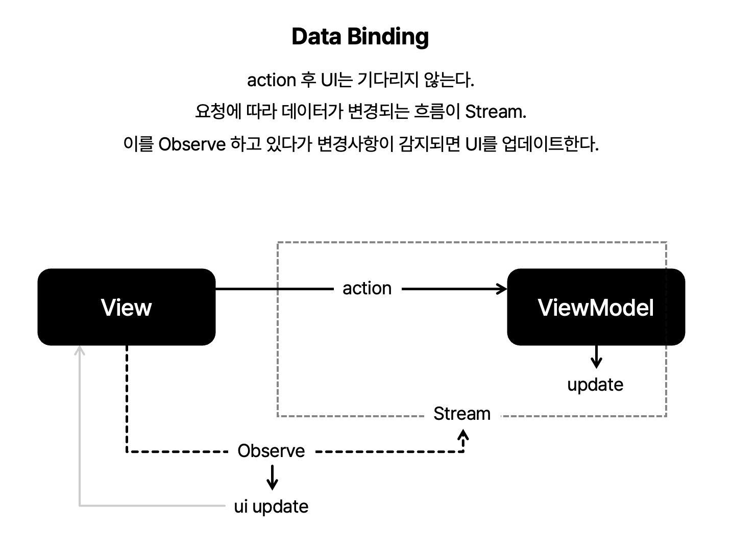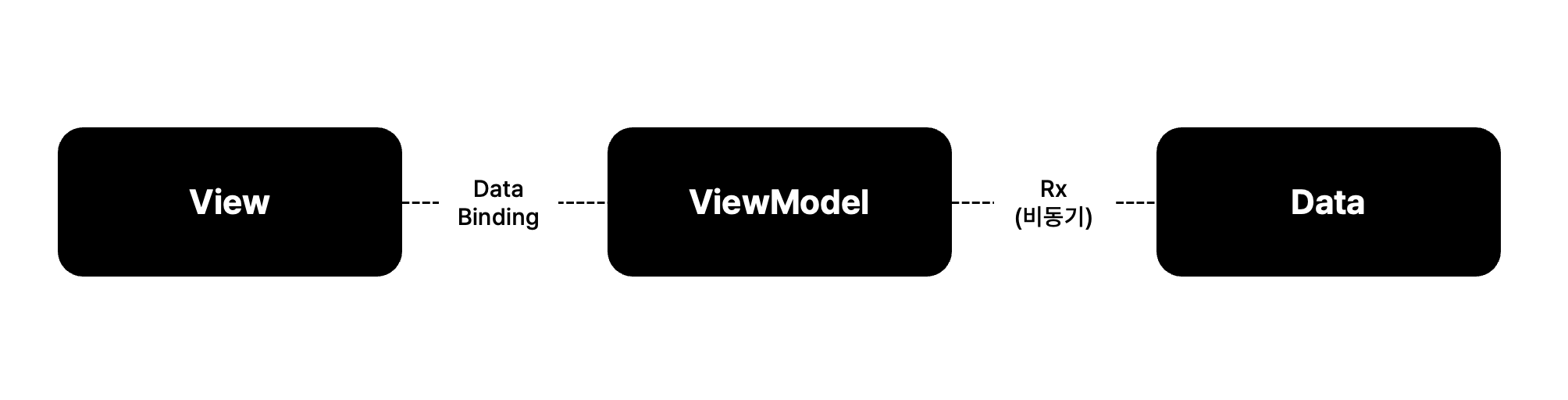 View와 ViewModel은 데이터 바인딩으로, ViewModel과 Data(==Model)레벨은 Rx를 이용할 수 있습니다.