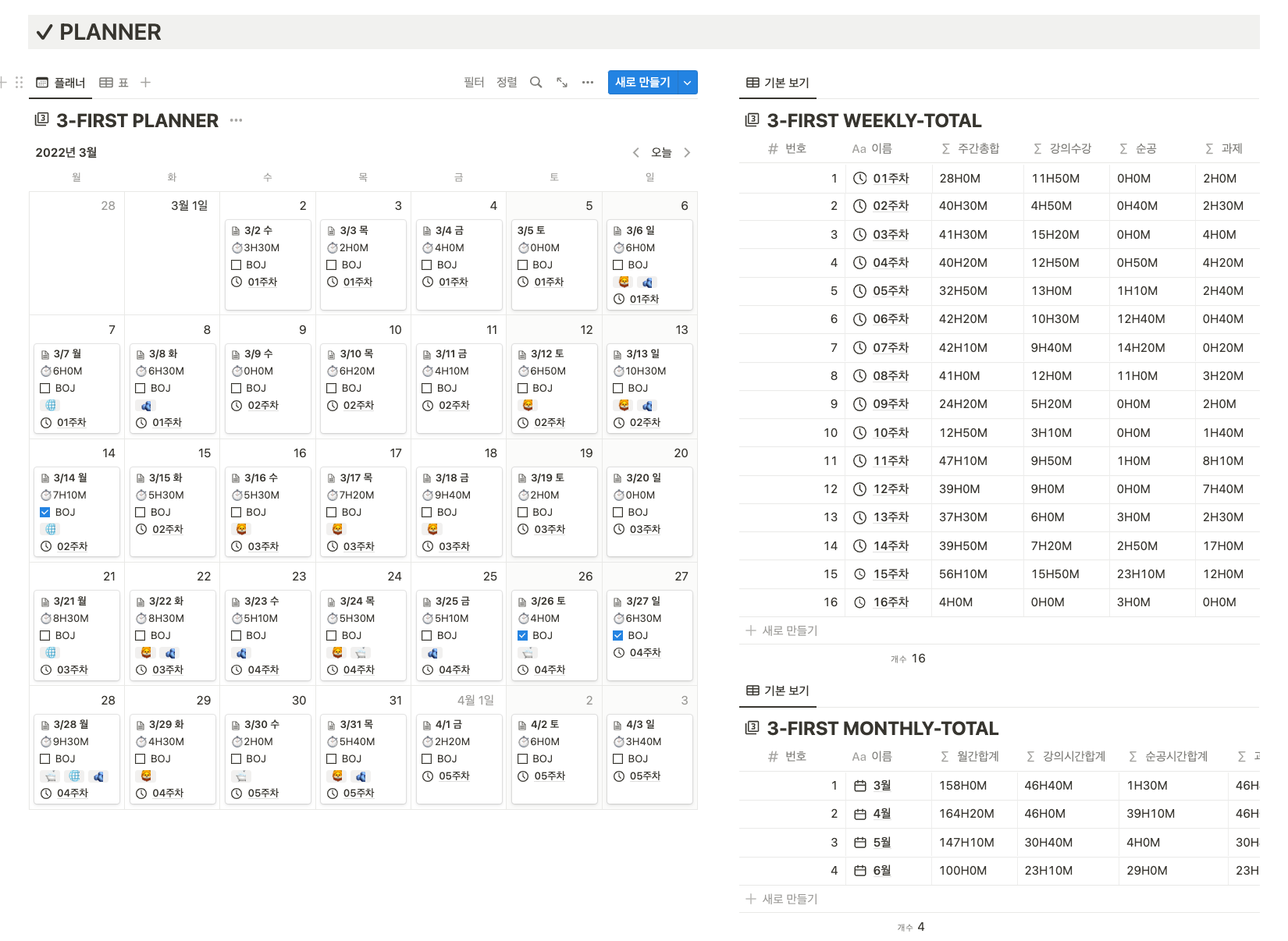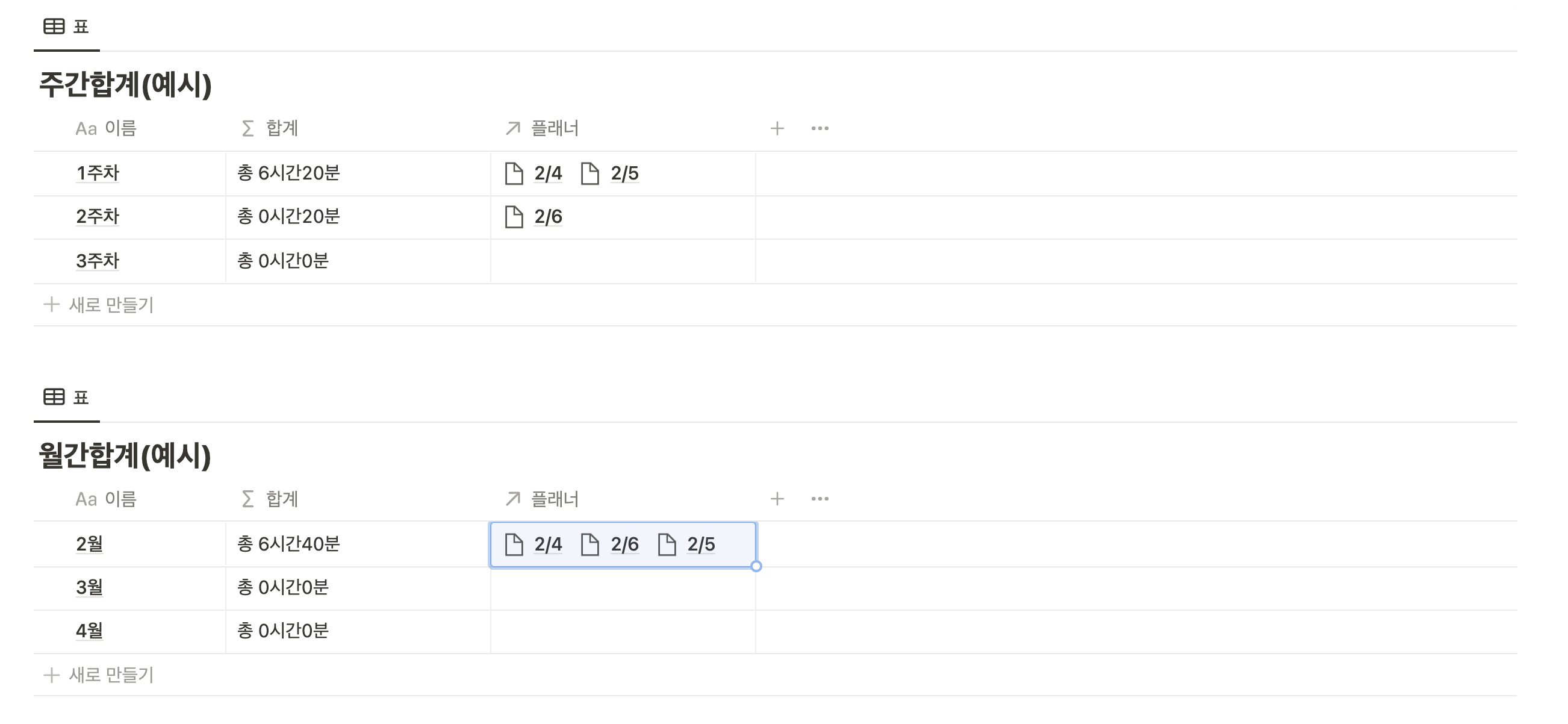 플래너 속성에서 주차와 월을 선택하면 주간합계, 월간합계에 자동으로 합산 시간이 나오게 됩니다.