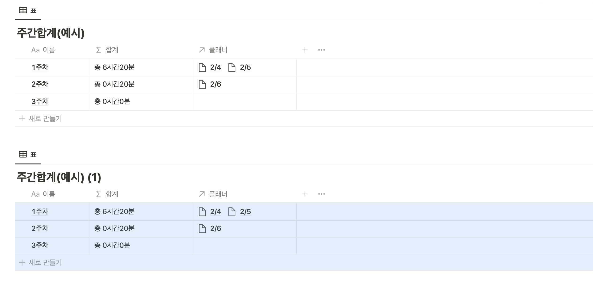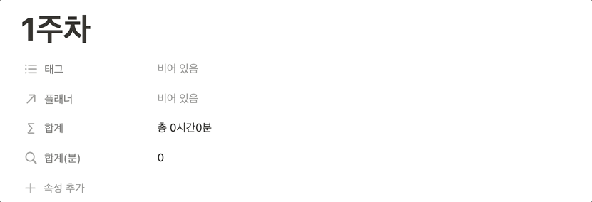 5. '플래너' 속성에서 해당 주차에 해당하는 날들을 추가해주면 합계가 계산됩니다.