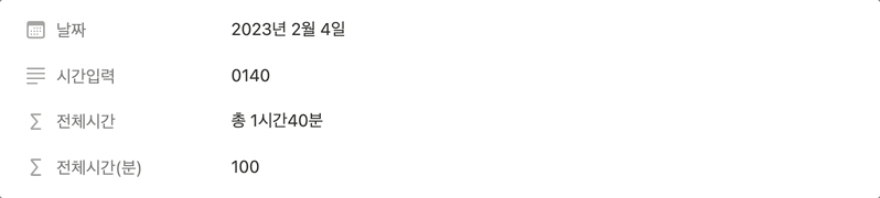 "총 " + format((prop("전체시간(분)") - prop("전체시간(분)") % 60) / 60) + "시간" + format(prop("전체시간(분)") % 60) + "분"
