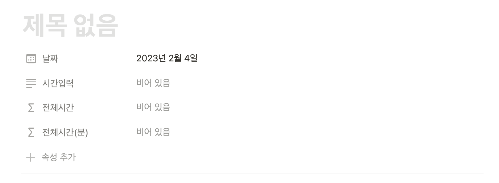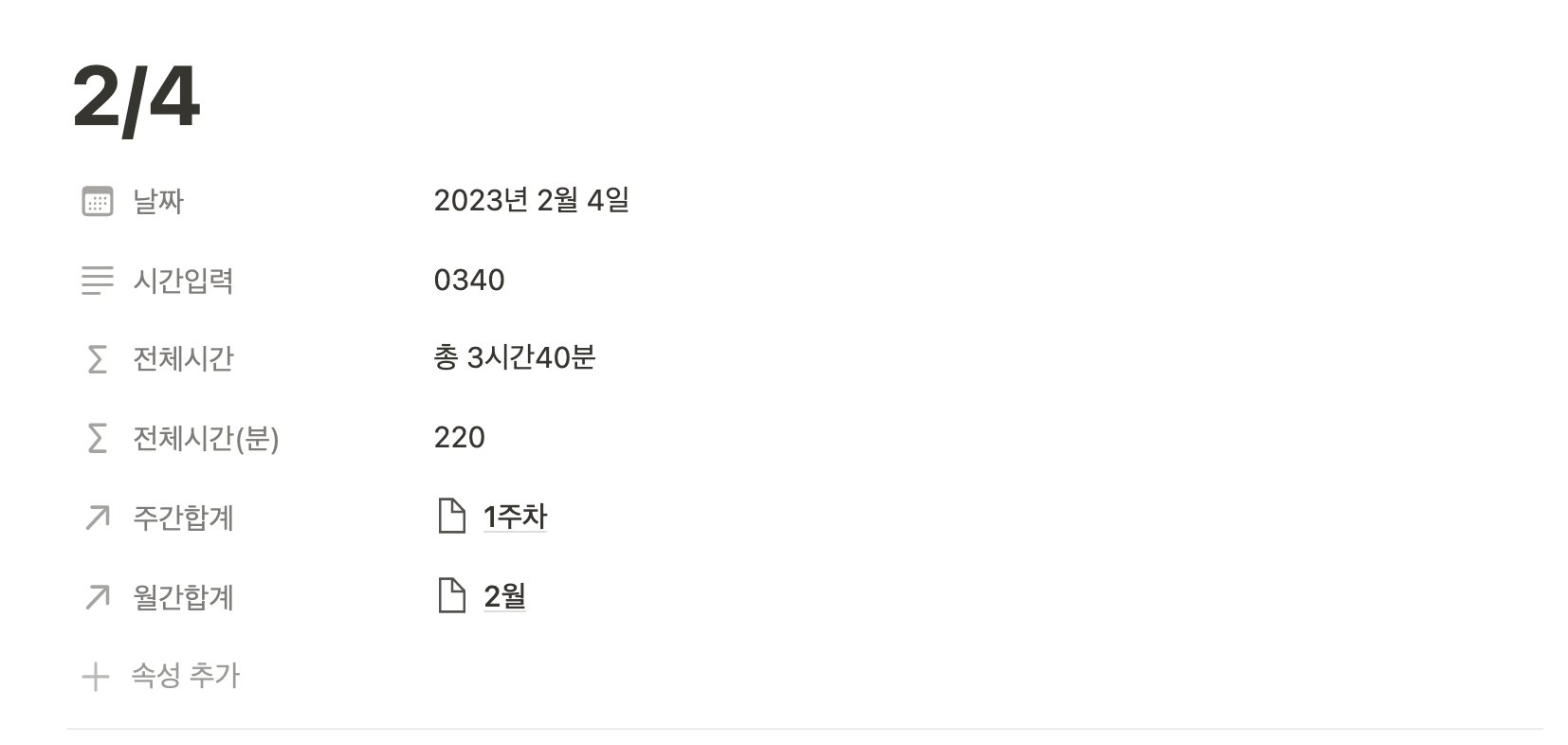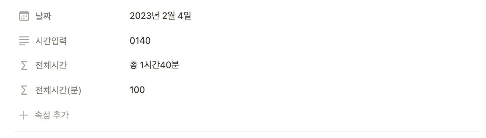 2. '+ 속성 추가'를 눌러 시간입력, 전체시간, 전체시간(분) 이렇게 총 3개의 속성을 추가합니다.