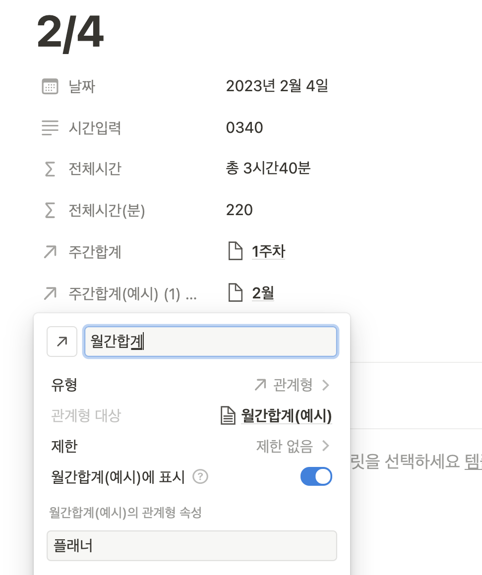 3. 플래너 데이터베이스에서도 새로생긴 연간관계 이름을 월간합계로 바꿔주세요