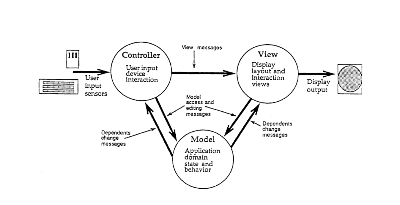 이때, 이 구조를 고안하게된 이유는 Small Talk으로 데스크탑앱을 만들기 위해서였다고 합니다. 콘솔에서 벗어난 GUI 개발이 시작되면서 화면을 그리는 로직이 생겨났고 데이터와 뷰의 책임 분리가 필요해진 것이죠.