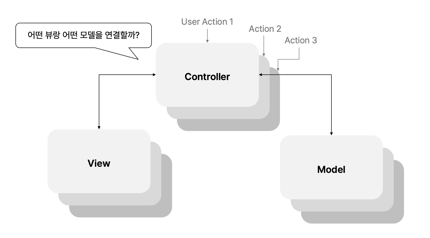 다시 MVC 정의를 보고 형태를 생각해 보면 이런 느낌이 됩니다. User Action에 따라 Controller가 View와 Model을 매개하고 있습니다.