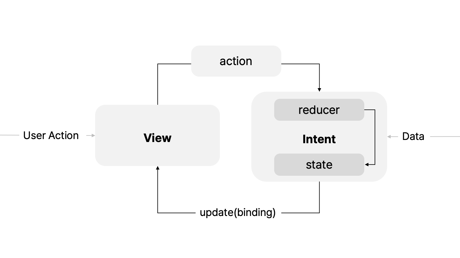 보시면 View->Intent->View로의 단방향 흐름이 형성되었죠. View는 Intent의 내부 메서드나 state에 직접 접근하지 않고 UserAction에 따라 지정된 Action을 발행해 Intent에 전달합니다. 그러면 Intent 내부의 Reducer가 이를 받아 액션따라 state를 변경하고, 데이터 바인딩에 따라 자동으로 뷰가 변경됩니다.