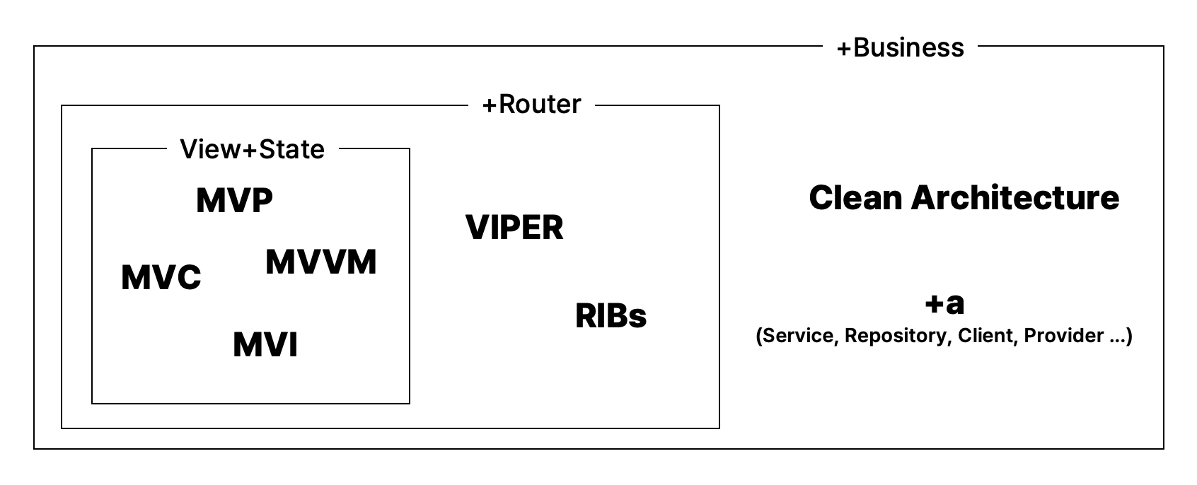 추가적으로 iOS에는 VIPER와 RIB등의 패턴도 있습니다. MV* 아키텍처에 조금 더해서 화면 전환(Route)에 대한 컨벤션을 정한 아키텍처입니다. 둘 다 해당 아키텍처를 따를 수 있는 템플릿이나 라이브러리를 제공합니다. 하지만 요즘에는 자주 사용하지는 않는 것 같습니다. 제 생각엔 라우팅에 관한 것은 위 아키텍처들의 아이디어를 참고해서 프로젝트에 맞게 녹여내는게 좋은 것 같습니다.