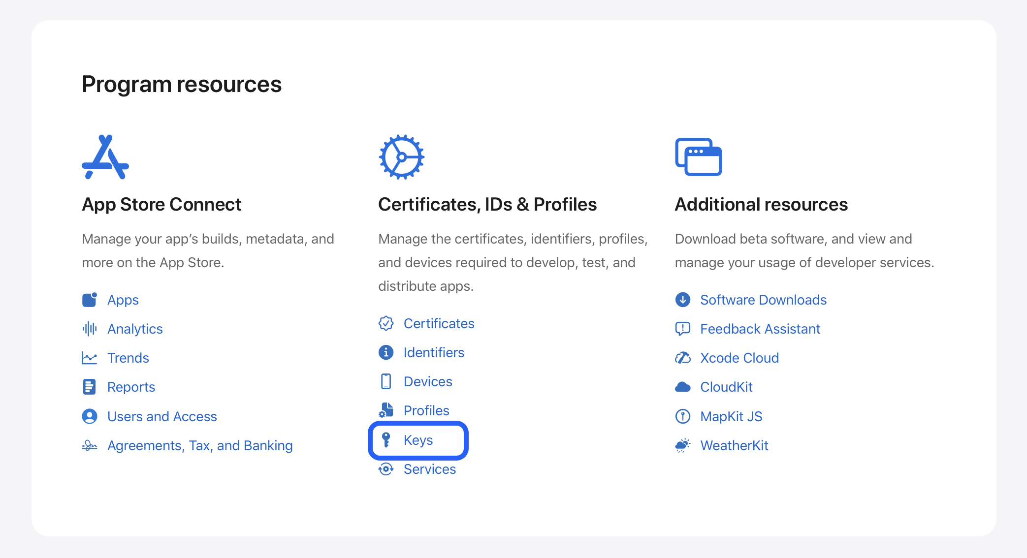 1. 우선 먼저 Apple Developer Member Center에서 Keys에 들어가줍니다.