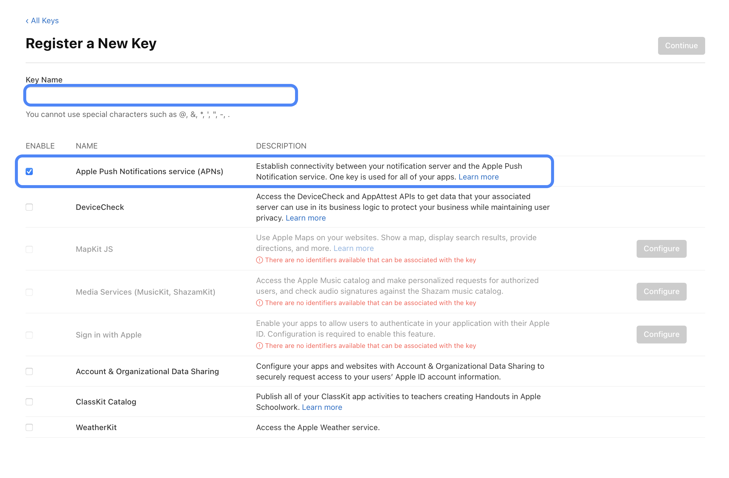 3. 적절한 이름을 작성하고, Apple Push Notification Service (APNs)항목에 체크합니다.