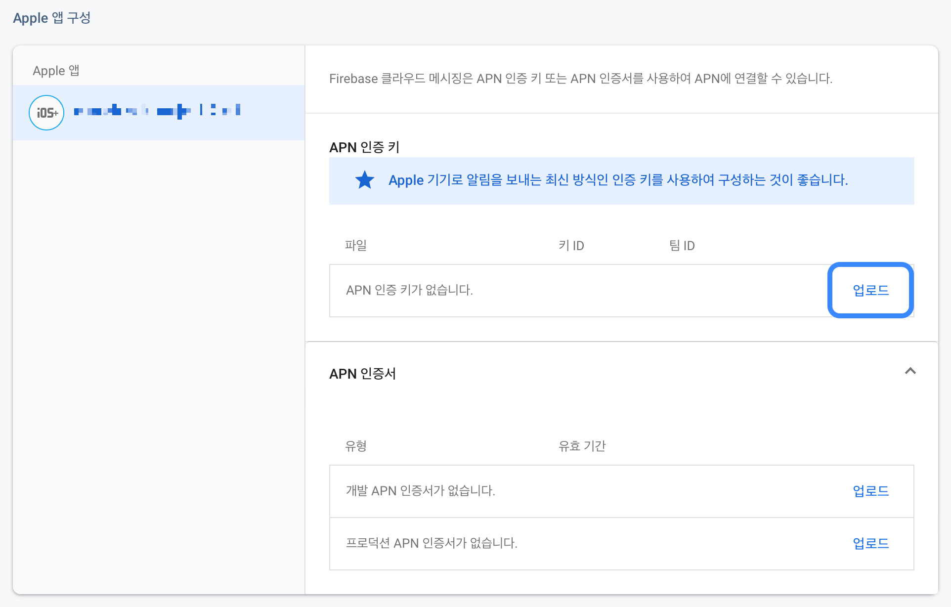 5. 클라우드 메세징 탭으로 들어가 APN 인증키 업로드를 진행합니다.