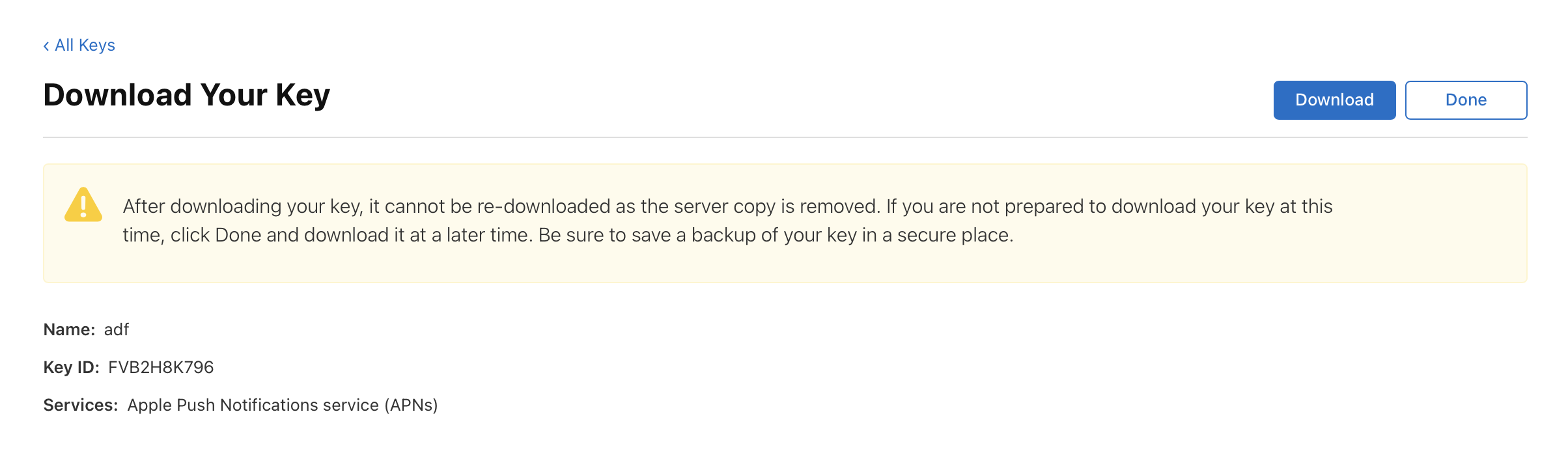 4. Continue > Register 를 완료하면 Download 버튼이 생깁니다. 이를 통해 p8파일을 다운로드합니다.