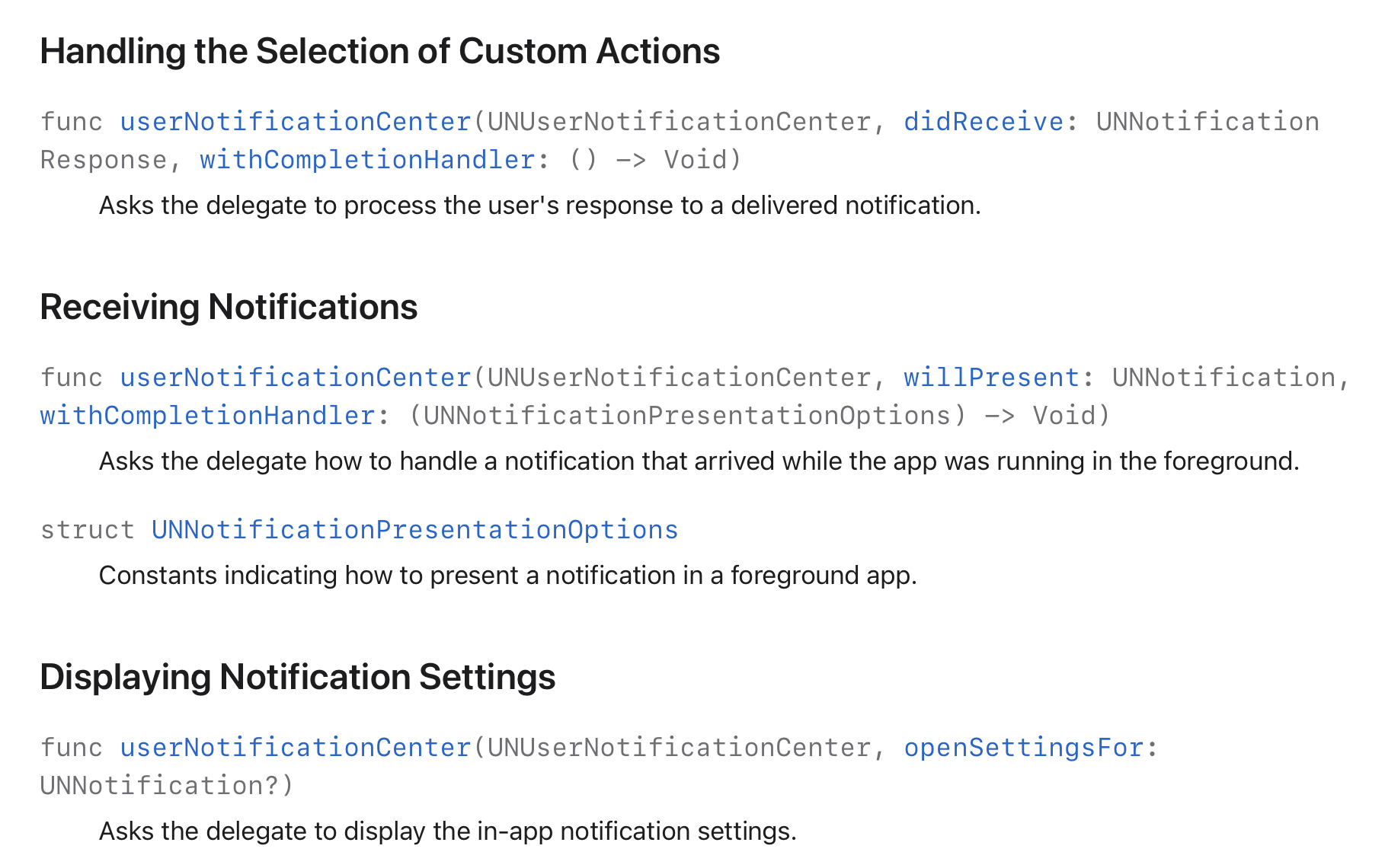 UNUserNotificationCenterDelegate에는 3가지 메서드가 있는데 하나씩 살펴보도록 하겠습니다.