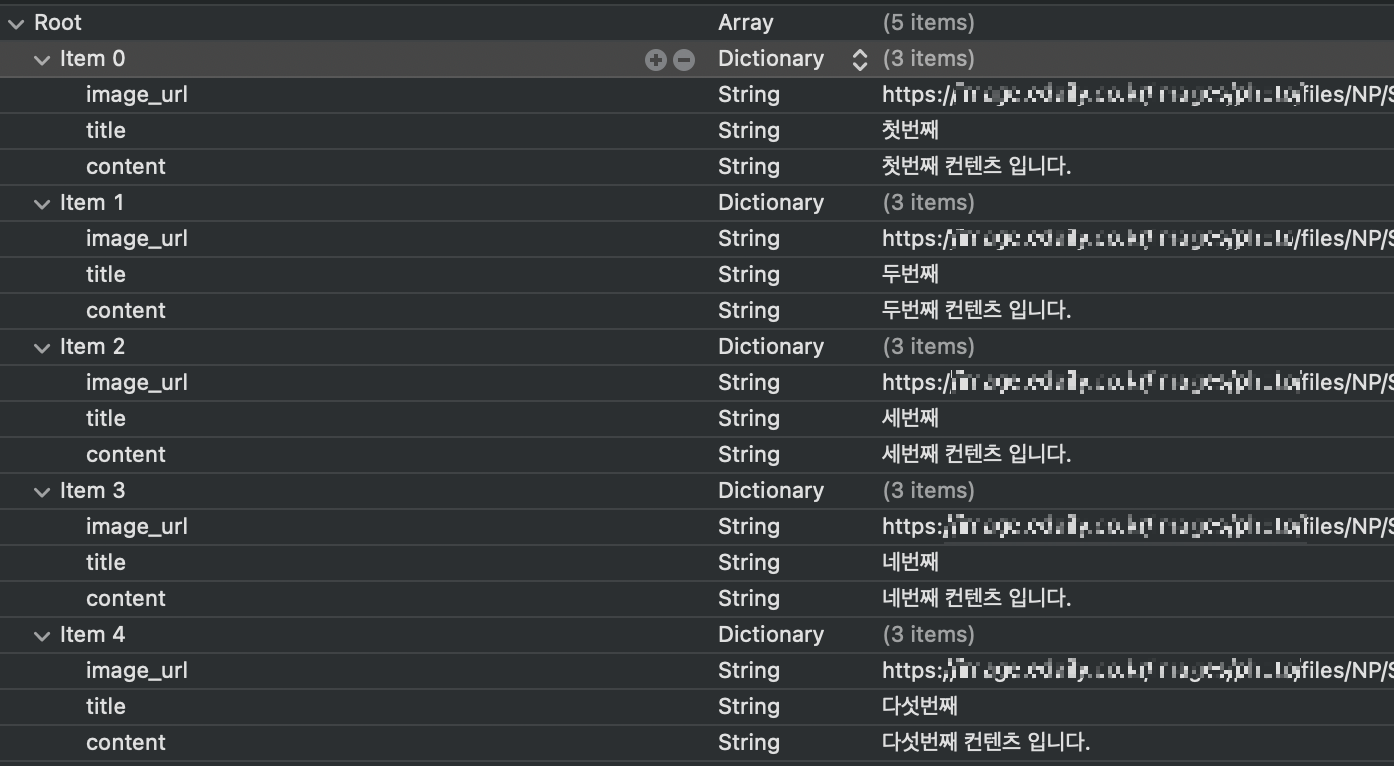 저는 Root를 Array로 만들고 image url, title, content를 가지는 Dictionary를 하위로 생성해주었습니다. 데이터 구조는 각각 상황에 맞게 수정하면 되겠죠?