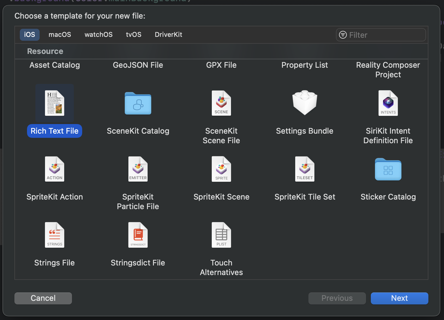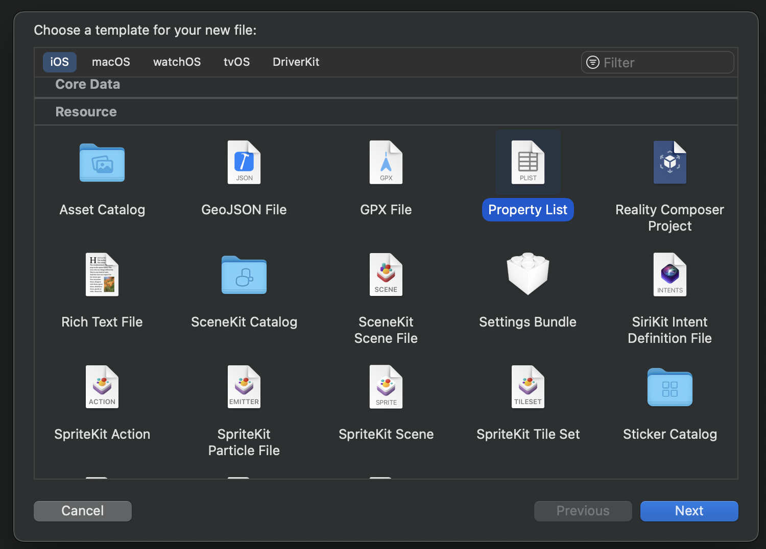 디렉터리 우클릭 > new file 옵션에서 스크롤하다보면 Resource 섹션이 있습니다. 여기서 먼저 Property List을 추가해보겠습니다.