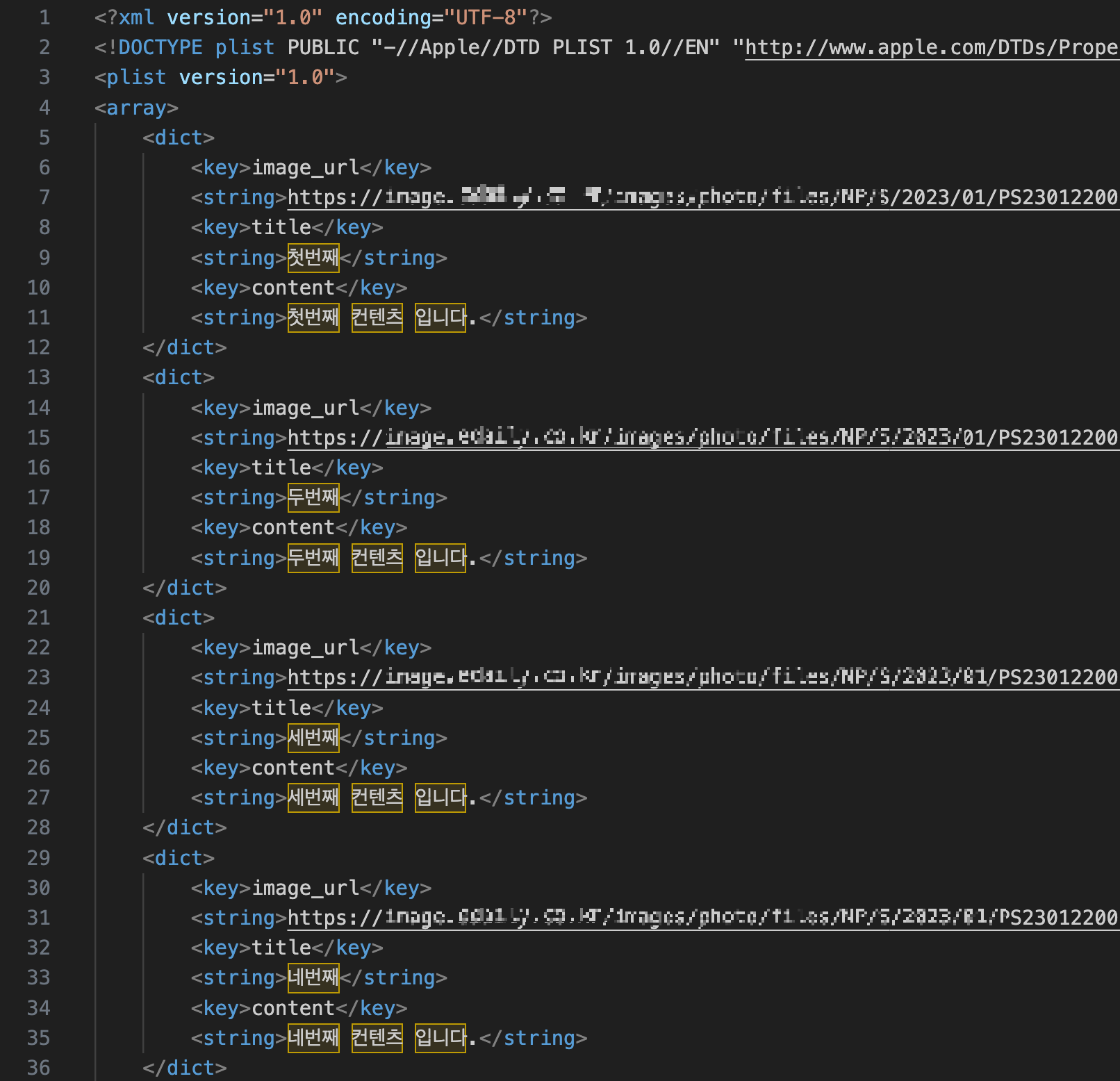 이때 plist 파일을 이용하면 더 깔끔하게 정적 컨텐츠를 관리할 수 있습니다.