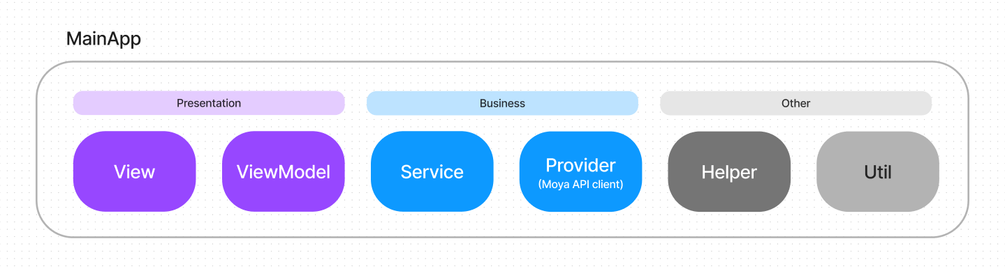 먼저 MVVM 패턴을 이용한 프레젠테이션 계층과 Moya라이브러리를 이용한 비즈니스 로직 계층이 있고