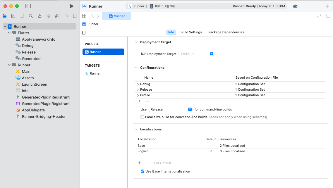 1. 먼저, ios > Runner.xcworkspace 파일을 통해 Xcode를 열어줍니다.