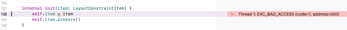 우선 Thread 1: EXC_BAD_ACCESS(code=1, address=0x0) 만으로 알 수 있는 정보는 거의 없기 때문에.. 오류의 시작점인 snp.makeContraints 부분부터 디버깅하며 인스턴스를 추적했습니다.