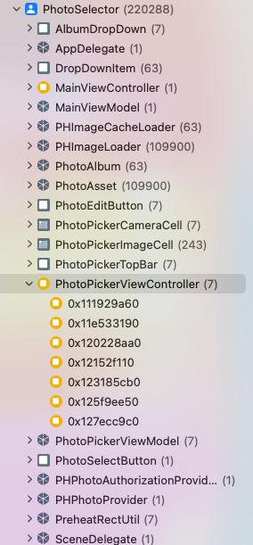 제 경우엔 PhotoPickerViewController를 dismiss했는데도 7개나 존재하는걸로 봐서 여기서 문제가 생긴 것 같네요.