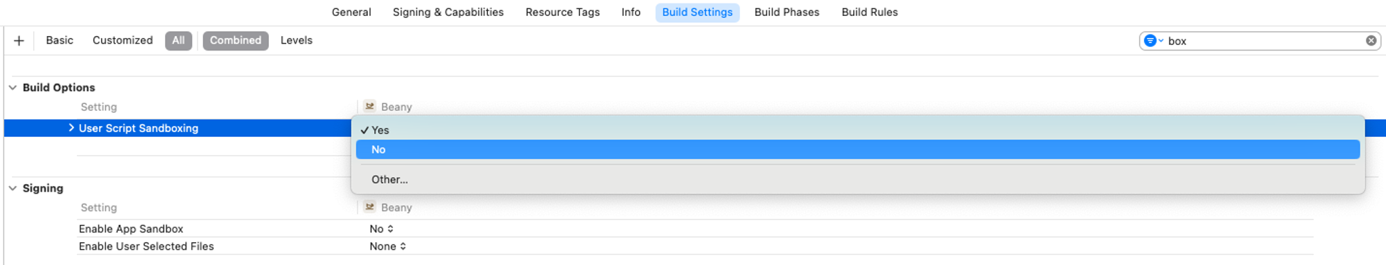 Build Settings에서 User Script Sandboxing을 No로 변경하거나 ENABLE_USER_SCRIPT_SANDBOXING 변수를 NO로 설정해주면 해결됩니다.